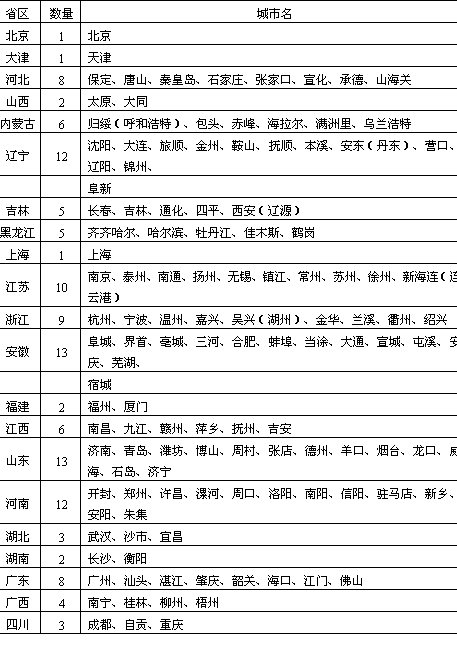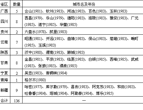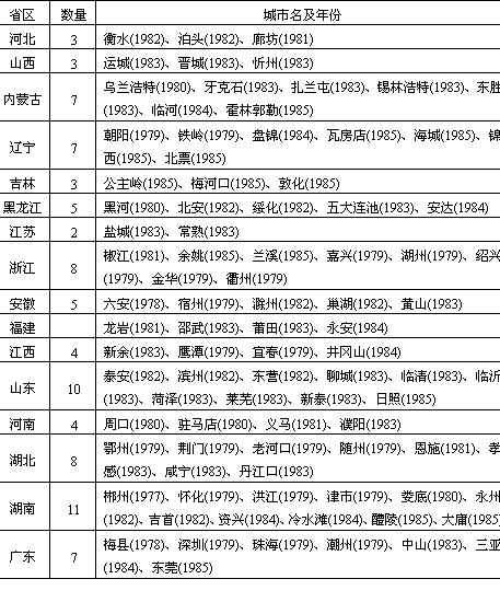 说明:(1)省区按现行行政区划分; (2)河北峰峰,辽宁葫芦岛,河南汝南,湖北老河口,四川北碚、合川,云南河口,麻栗坡等8城市,曾一度设置并撤销(包括与其它城市合并),故未列入; (3)台湾及港澳地区暂未列入。 资料来源:《中华人民共和国县级以上行政区划沿革》(1949—1983);《中华人民共和国政区沿革》(1949—1979)第192页。