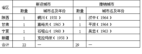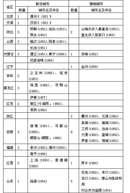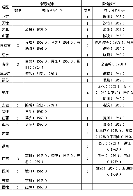 说明:(1)安徽省铜陵市1964年撤销市建制记载不一,故表中按未撤销计入; (2)省区按现行行政区划分; (3)城市名后括号中数字为设置和撤销年代; (4)台湾及港澳地区暂未列入。 资料来源:《中华人民共和国县级以上行政区划沿革》(1949—1983);《中华人民共和国政区沿革》(1949—1979)。