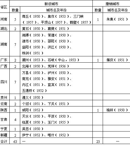 说明:(1)台湾及港澳地区暂未列入 (2)省区按现行行政区划分 资料来源:(1)《中国人民共和国县级以上行政区划沿革》(1949—1983年) (2)史为乐编《中华人民共和国政区沿革》(1949—1979)第152页,江苏人民出版社出版。 济制度发生根本变革的时期,城市经济发展以变消费性城市为生产性城市为特征。城镇体系的发展主要表现在两个方面,一方面,在广大东部地区撤销一批小城市,有重点地建设一批枢纽城市;另一方面,在广大中西部地区新建了一批新工业城市。城镇体系处于比较稳定而且健康的发展之中。据资料统计,自1949年至1957年的9年中,我国城镇人口占总人口的比重由10.6%上升到15.4%,年平均递增率高达70.5%。这一时期累计新设城市71个,主要分布在湖南、四川、河南、云南、甘肃、黑龙江、内蒙古、山西、河北、安徽、福建等省区。与此同时,在安徽、山东、浙江等省区连续撤销了23个城市。上述新设的71个城市中,河北峰峰,辽宁葫芦岛,河南汝南,湖北老河口,四川北碚、合川,云南河口、麻栗坡等8城市也因种种原因相继撤销市建制。因此,到1957年底,我国已有城市176个,比1949年的136个增加了29.4%,平均年递增5个新城市(表7-2)。 表7-2 1950—1957年城市设置及撤销统计表