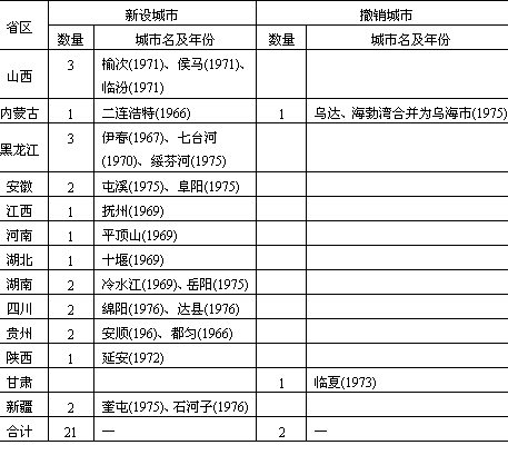 说明:(1)1977—1985年间,辽宁铁法,山东新汶、湖南冷水江3个城市曾一度设市后又撤销市建置; (2)台湾及港澳地区暂未列入。 资料来源:《中华人民共和国县级以上行政区划沿革》(1949—1983年);《中华人民共和国行政区划简册》(1986年)。