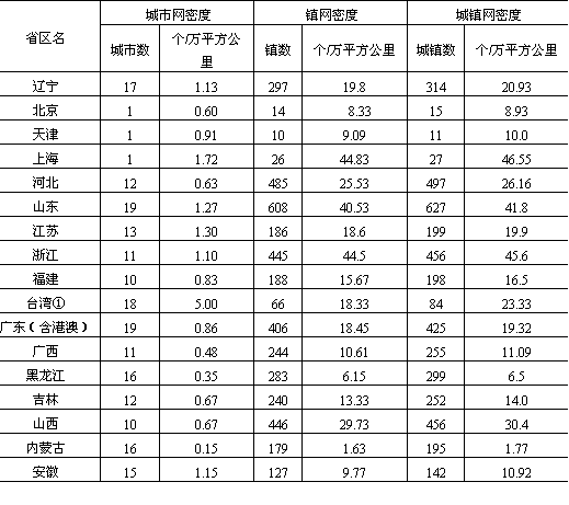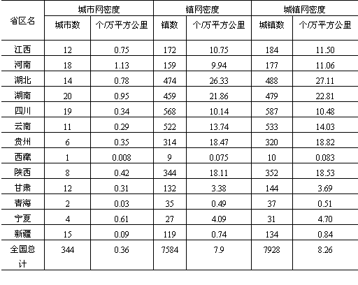 省区(它们多为“三线”重点建设地区),镇网密度在每万平方公里10—20个镇之间;其它省区镇网密度最低,一般均在每万平方公里10个镇以下。 从局部地域看,这种差异更大。如经济发展水平较高的江苏省,苏南地区的苏州市域,平均每24.5平方公里就有一个镇;而苏北地区平均69.8平方公里才有一个镇。在经济发展水平较低的山区或边远地区,镇分布更疏,如在东北大兴安岭地区,每1800平方公里才有一个镇,内蒙古的乌拉特草原22000多平方公里仅有一座