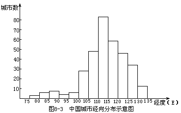 从城市的经向分布看(图8-3),我国城市以东经110—125度内最为集中,几乎占城市总数的70%左右,其间分布了全国70%的特大城市、90%的大城市、80%的中等城市和将近一半的小城市;东经100—110度次之,约占城市总数的20%,其中分布了全国30%的特大城市,以及少数大、中城市和较多的小城市;而东经100度以西的广大地区,城市数量很少,仅占全国城市总数的6.4%,城市分布寥若晨星(表8-2)。