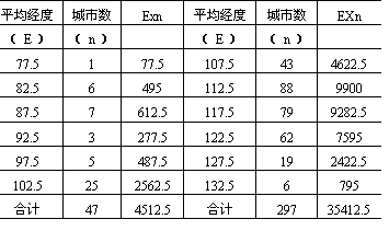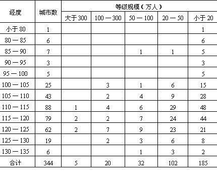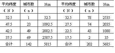 城市空间分布测度的另一形式是经纬网内分布状况。我国疆域辽阔,所囊括的经纬度跨度较大(自南而北跨纬度49度多,从东到西跨经度60多度)。从我国城镇体系的地域分布看,城市主要集中于北纬20—40度及东经105—125度的地区。