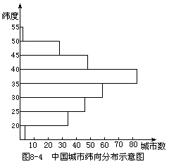 若以我国城市集中分布的北纬35度纬线为基准,我国城市经向分布的线密度为东经110—125度间,东西垂直距离约每5.9公里就有一个城市,东经100—110度间,东西垂直距离约每13.2公里一个城市,东经75—100度间,东西垂直距离约103.5公里才有一个城市,分别是东经110—125度间的2.2倍和17.5倍。 再从城市的纬向分布看(图8-4),我国城市又以北纬30—40度间最为集中,其间共有城市150个,约占全国城市总数的43.6%,集中了我国60%的超大城市(人口300万以上),70%的特大城市, 表8-2 我国城市经向分布统计表(1985年)