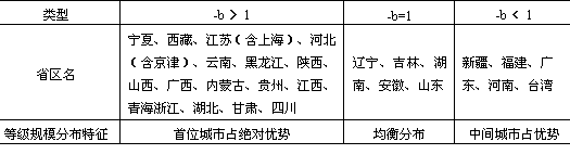 中b与q也具有对应关系。 在布腊德弗德——肯特城市等级规模分布模型中,如果q=1,则表示了戚夫(G.K.Zipf)提出的等级规模法则:Pr=P1/R;如果q>1,表示城镇体系中大城市占优势;如果q<1,则表示城镇体系中中间城市占相对大的比重;如果q=0,则表示城镇体系中各城镇规模相等。据此,我们依据表9-8中(-b)常数的不同可将我国各省区城市等级规模分布划分为以下三种类型(表9-9)。 表9-9 我国分省区城市等级规模分布类型表