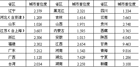 按照我国分省区城市首位度指数大小,可将分省区城镇体系划分为三大基本类型: (1)双极型。经济发达水平居中的各省区,城市首位度指数较低,一般都在1.0~2.0之间。由于它们是经济发展中的省区,受近代交通因素作用明显,省区城镇体系在等级规模关系和地域空间结构方面都呈双极发展型式。如山东的济南——青岛,广西的南宁——柳州,宁夏的银川——石嘴山,京、津、冀的北京——天津,吉林的长春——吉林,山西的太原——大同,内蒙古的包头——呼和浩特,安徽的合肥——芜湖,河南的郑州——洛阳,四川的重庆——成都等。 (2)均衡型。在经济发达的省区,中心城市作用明显,且城市等级规模系列比较完整。因此,城市首位度指数居中,一般介于2.0~4.0之间,如江苏(含上海)、辽宁、台湾、广东(含港澳)、浙江等省区。此外,有些省区经济发展水平尽管居中,但已基本形成比较完整的城市等级规模系列,其城市首位度指数也介于2.0~4.0之间,如福建、湖南、江西和黑龙江等省区。 (3)极核型。在经济发展中的省区,由于中心城市刚刚形成或正在形成,次级城市非常薄弱,城市首位度指数一般都比较高。如中心城市已经形成的省区:湖北、陕西、甘肃、青海、云南等;中心城市正在形成的省区:新疆、贵州、西藏等。