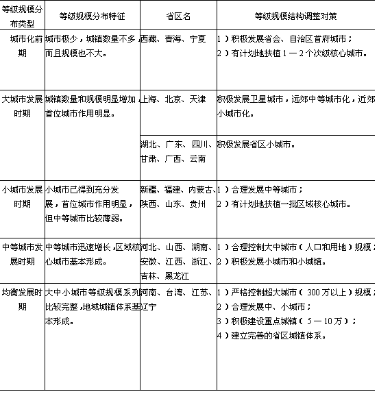 根据1984年分省区城镇体系内城镇数量和城镇人口数统计,不难发现,若依据地域城镇体系等级规模分布与地域城镇化水平相对应规律,参照我国各省区城镇等级规模系列和城市首位度的区域差异特征,可将我国分省区城镇体系的等级规模分布划分为城市化前期、大城市发展时期、小城市发展时期、中等城市发展时期和大中小城市均衡发展时期五个不同的类型。依据不同类型的城镇体系等级规模分布特征提出我国分省区城镇等级规模结构调整对策如下表(表9-12)。 表9-12 我国分省区城镇等级规模结构调整对策