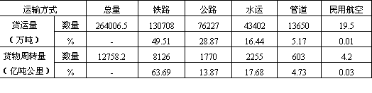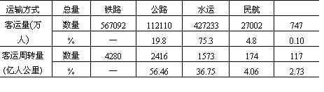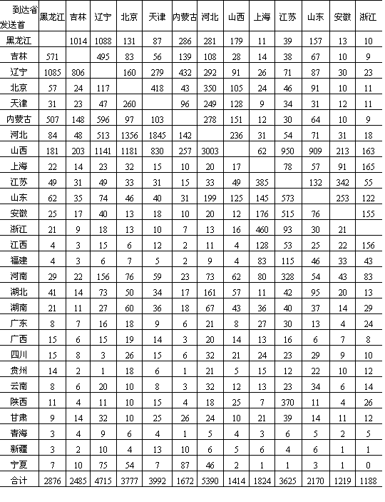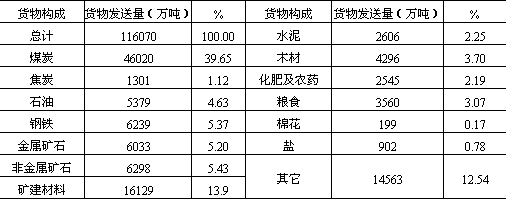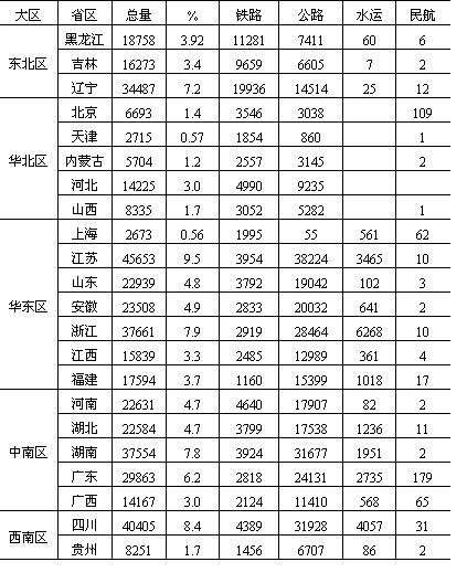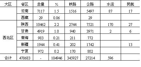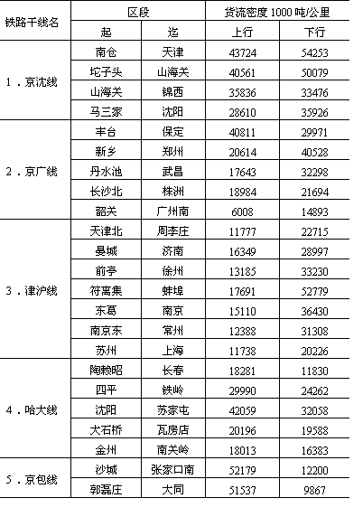 (镇)联成一个有机经济整体。其货运密度上行(苏家屯——沈阳)达4000万吨/公里,下行3000万吨/公里,仅次于京沈铁路和京广铁路,位居全国第三。 海上交通大动脉——沿海货运干线及港口。我国沿海货运干线紧邻我国经济最发达、人口密度最大、资源消耗量最多的东部沿海经济发达地带,我国90%以上的进出口物资的集、疏、运都集中在这一地区。整个沿海运输干线货运量计约担负全国北货南运量的1/3,而且具有明显的北航区大于南航区的特点。 (3)东西向联系。尽管我国的城市和工业大部分集中在京广线以东的地区和东北地区,京广线以西正处于开发或待开发阶段,但由于我国矿产资源和经济发展的相向递度差异,也相应形成了陇海、京包、石太——石德——胶济、沪杭——湘赣和滨洲——滨绥等五条铁路货运干线和长江干支流水运干线,成为城镇体系内东西向联系的主要通道。 “黄金水道”,东西运输枢轴——长江水运干线。长江流域既是我国人口众多、经济发达的地区,又是我国重要的工农业基地,拥有丰富的矿产资源。每年都有大量物资通过长江干支流集散,或转铁路和海运输向全国各地,并承担大量进出口物资的运输,成为我国东西交通的最大动脉。货运总流向东运大于西运。 晋煤外运干线——京包线和石太——石德——胶济线。我国山西煤炭基地由西向东的晋煤大量外运及出口,主要经过两条干线。其一为北线,由京包铁路东接京沈线,西接兰新线,沿线自京津唐城市群,经大同煤炭基地到包头钢铁基地,尤其东端大同——张家口——北京——天津——秦皇岛,是我国由西向东的主要晋煤外运干线和出口通道。其货运密度上行明显大于下行,尤其沙城——大同段上行密度已达5000万吨/公里以上,下行仅在1000万吨/公里左右,成为我国东西向铁路货运密度最大的区段。其二为石太——石德——胶济铁路的中线晋煤外运及出口通道。其上行最大货运密度也达4000万吨/公里,下行一般在1000万吨/公里左右,成为东西向仅次于京包、陇海二线的东西通道。 沟通东西的全国铁路网横轴——陇海、兰新线。陇海线是我国铁路网东西大动脉,横贯全国中部,与津沪、京广、太焦——焦枝——枝柳、宝成、包兰、兰青等铁路相交,位居我国煤炭基地分布中心地域,为我国西煤东运、北煤南运的主要通道和汇集线。货流特征为三门峡以东、徐州以西上行大于下行,三门峡以西下行大于上行,上、下行货运密度一般都在1500万吨/公里左右。 南方横贯东西交通大动脉——沪杭、浙赣线。此线自上海起,横跨我国东南、中南、西南三大地域,与长江航运线、陇海线平行,组成我国东西向的第三条货运干线。承担着我国东部与西部、沿海与内地三大区之间的经济联系。整条线路货流以向东为主,货运密度上行一般在1000万吨/公里以上,下行多在1000万吨/公里以下。 此外,在东北运网中的滨洲——滨绥线东西向铁路,与哈大线成“T”形相交,成为东北地区东西货运最重要干线。尤其是大庆——牡丹江沿线,货运密度已达3000万吨/公里左右,成为我国大小兴安岭、长白山木材生产基地,大庆油田、松嫩平原和三江平原以及呼伦贝尔盟农副产品的主要货流汇集线。 我国主要铁路干线区段货流密度详见表11-8。 从1984年统计资料看,全国省区际货流相当频繁(表11-9)。省际货流量最大者为山西省,达1.1亿吨以上,最小者为青海省,货流量仅及山西的1%。