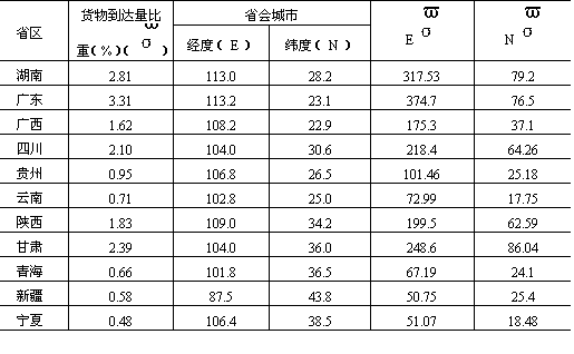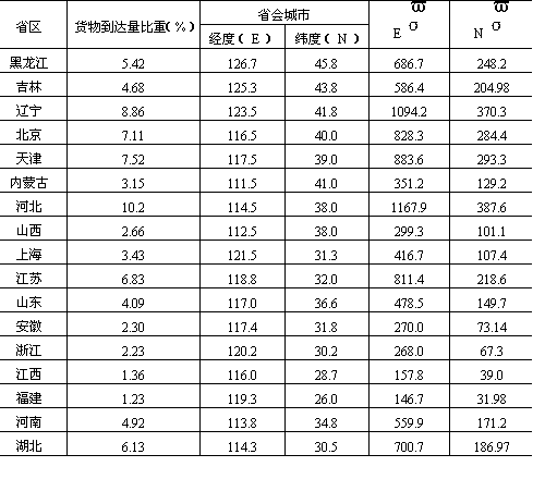 冶矿资源主要分布于西部、北部,而加工工业长期偏集东部沿海,这是形成我国城镇货流流向的物质基础。根据1984年我国分省区货物到达量计算,我国省际货流分布重心在北纬35.81度,东经115.85度(表11-5),大致位于山东省郓城县附近(菏泽市东北约75公里处),偏离我国几何中心经度12.85度、纬度1.19度,直线距离约1430.45公里。说明我国城镇体系内城镇间货流的内聚倾向偏于我国沿海,尤其东南沿海加工工业发达城市。 表11-5 我国城镇货物到达量分布重心计算表(1984年)