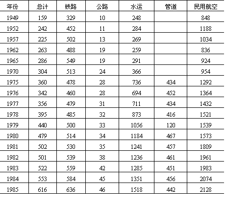 说明:(1)水运不包括远洋运输; (2)管道输送天然气按每1000立方米合一吨计; (3)货物周转量包括公路运输中社会车辆完成数量; (4)台湾省及港澳地区暂未列入。 资料来源:《中国统计年鉴》(1986)。