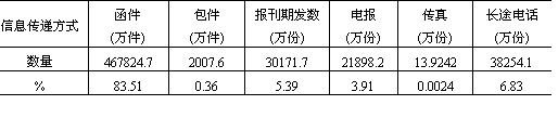 (2)我国邮电业务量构成,邮递以函件为主,电讯以长途电话为主。据1985年资料统计,我国函件、长途电话分别占邮电业务总量的83.51%和6.83%,报刊期发数、电报分别占5.39%和3.9%,包件及传真均不及0.5%(表11-15)。与1952年我国邮电业务构成相比(函件占95.07%,报刊期发数1.6%,电报1.4%,长途电话 表11-15 我国城镇间邮电业务量构成统计表(1985年)