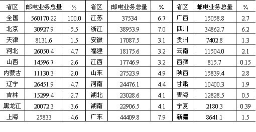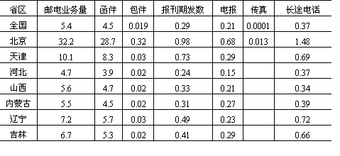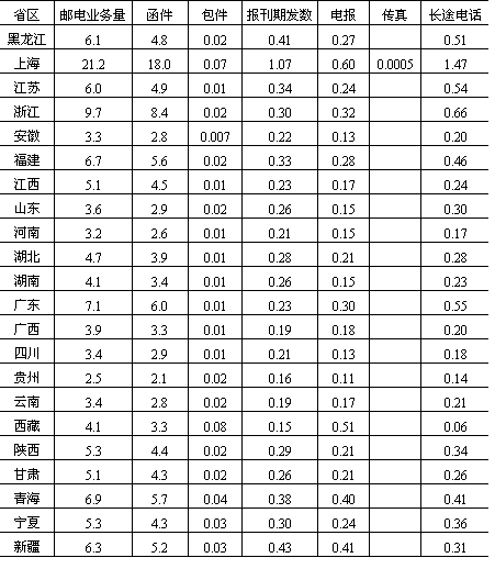 说明:(1)台湾及港澳地区暂未列入; (2)邮电业务总量主要包括函件、包件、报刊期发数、电报、传真、长途电话等。 资料来源:《中国统计年鉴》(1986年)。