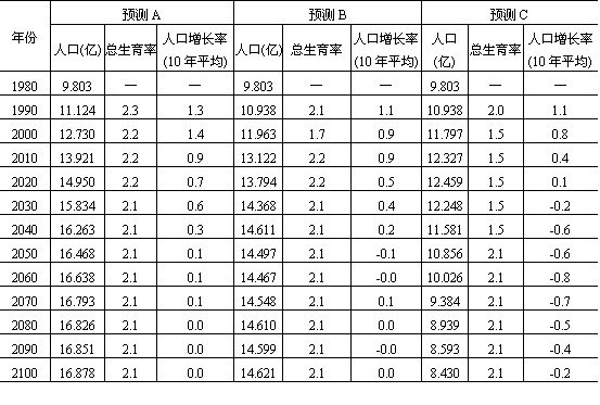不难看出,这个着极限是随资源开发规模加大,劳动生产率和生活水平的提高而变化的。 在我国近代首先讨论中国适度人口问题的是孙本文教授。他于1957年明确提出这一科学命题,并依据我国自然资源和工农业生产的发展趋势,认为8亿人口是中国最适宜的人口数量①。 1979—1980年,田雪源、陈玉光从经济发展、国民收入增长、消费资料增长、劳动力人口和社会总人口之间的关系研究了中国适度人口,认为在100年后的现代化社会中,我国总人口数量应保持在6.5—7.0亿之间对经济发展最有利②。 1981年胡保生、王浣尘、朱楚珠、李维岳又运用系统工程中的多目标决策技术和方法研究了中国未来的适度人口数量,经过综合分析粮食生产、动物蛋白食品鱼肉供应量、生活和工交占地、淡水与能源供应、平均收入以及人口状态和人口老化程度等因素,认为中国百年后人口总数应保持在7~10亿为好③。 与此同时,宋健、宫锡芳、宋子成、孙以萍等的“中国理想人口目标的定量研究和优化分析”④,以我国食物生产预测和淡水资源为基础,认为从食品供应看,下一世纪后半期我国适度人口应在7亿或7亿以下;从我国淡水资源和发达国家用水标准看,适度人口应在6.3~6.5亿之间。 1984年胡焕庸、张善余教授合著的《世界人口地理》也概略地探讨了我国各项自然资源及其对未来经济和人口发展的制约作用。认为“一个国家和整个地球在一定的生产力发展水平上,所能供养的人口是有限的,精确地回答这个限度在哪里当然是困难的”⑤。“我们不应该以消极的眼光来看待理想适度人口问题”。同时也将7亿人口作为我国既有其合理性,又有其现实可能性的调整和控制人口目标。 综上所述,我国理想适度人口在10亿以下,最好在7亿左右。人口规模的确定为我国制定各项人口政策和总人口预测奠定了理论基础。 2.总人口发展预测 当前我国的人口状况和趋势同世界很多发展中国家非常相似,面临着人口急剧增加的严峻局面。从1985年的资料看,尽管自然增长率已从1974年的1.7%降至1.1%,但由于正面临着一个新的生育高峰,人口绝对数却从9亿增加到10.45亿(尚未包括台湾及港澳地区人口)。现状总人口正处于急剧增长时期,即使继续执行计划生育的人口政策,总人口数量仍会继续上升,还不可能向理想适度人口数量发展。 关于我国总人口发展预测,国内外许多学者和机构做了大量的工作,这里仅引用其结论,作为预测我国城镇人口的参数。 (1)世界银行的三种人口预测。世界银行1984年经济考察团采用世界银行的标准方法,对我国1980—2100年总人口进行了三个方案的预测(表13-1),其中预测(B)的推算同我国政府为2000年所订的人口目标为12亿相吻合,根据这一推测,2000年时我国总人口为11.96亿,2050年为14.497亿①,到2100年趋于不变,稳定在15亿的水平上;预测(C)则按我国总生育率1.5计,一直维持到2040年,然后再回到更替水平。根据这一预测,2000年人口约为11.8亿,2050年约为10.85亿,及至稳定时(2100年)可望下降到8亿左右,接近于我国的理想适度人口。 (2)按不同生育率的总人口预测。1979年底宋健等根据当时 表13-1 世界银行1980—2100年的三种人口预测方案