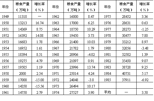 我国耕地少人口多,农村劳动力过剩。据有关部门统计,目前我国有约3000万农村劳动力已完全脱离农业生产,从事乡镇工业 表13-3 我国历年粮食产量及其增长率