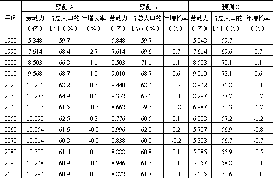 生产或在城镇做临时工。而事实上,农村剩余劳动力数量更大。根据1976年材料,世界主要国家农村劳动力平均耕地数,美国1244亩,加拿大1092.4亩,苏联135.5亩,法国118.7亩,罗马尼亚40亩,南斯拉夫28.7亩,印度也达19亩,而我国仅5亩。有人预测到2000年,随着农业现代化的发展,我国每个农村劳动力平均负担耕地可达15亩,这样农村剩余劳动力将达2亿人。根据世界银行、宋健等对我国劳动力的预测(表13-5、13-6),2100年我国劳动力总数约5.1~8.9亿人,即使维持劳动力耕地15亩的水平(即1亿劳动力从事农业生产),仍然有4—8亿可以从事非农业生产。这说明我国城 表13-4 按可提供口粮预测城镇人口(2100年)