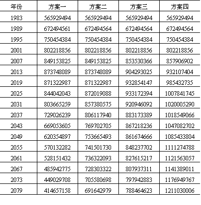 说明:(1)方案一,妇女平均生育率从1982年的2.63逐年下降,到1984年下降为2.40,1990年下降到1.70。从1995年以后长期保持1.50; (2)方案二,妇女平均生育率从1982年的2.63逐年下降,到1984年下降为2.40,1990年下降到1.70,1995年下降到1.50。但从2001年开始全国平均生育率恢复到2.0; (3)方案三,妇女平均生育率从1982年的2.63开始逐年缓慢下降,到1984年降为2.40,1990年下降到2.0,此后永远保持在2.0的水平上; (4)方案四,妇女平均生育率从1982年的2.63到1984年下降到2.40,以后一直保持在2.40的水平以上。资料来源:《人口控制论》,第244—245页。