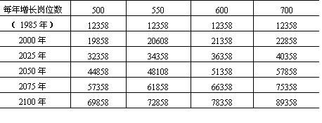 80%,而我国1985年第三产业就业人数仅为第一产业就业人数的26.17%。若将这个比例提高到70~100%,每年城镇又可新增就业岗位140~200万个。再次,从乡镇企业吸收剩余劳动力状况看,全国乡镇企业就业人员1980年为2999万人,1981年为2969万人,1982年为3113万,1983年3235万人,1984年3848万人,1985年4152.14万人。5年平均每年增加230.63万就业岗位。按照上述速度递增,到2100年我国可新增就业岗位如表13-8。 根据表13-8,若我国每年新增就业岗位500—700万,则到2100 表13-6 宋健等对我国百年劳动力预测(四方案)