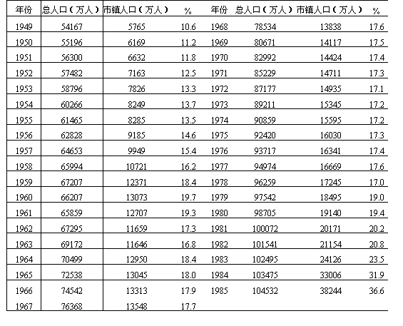 资料来源:(1)联合国《1977世界人口情况》; (2)联合国《1980—2000年世界城市人口和农村人口增长》; (3)国家统计局《中国统计年鉴》(1986年)。