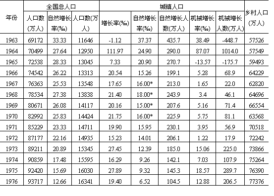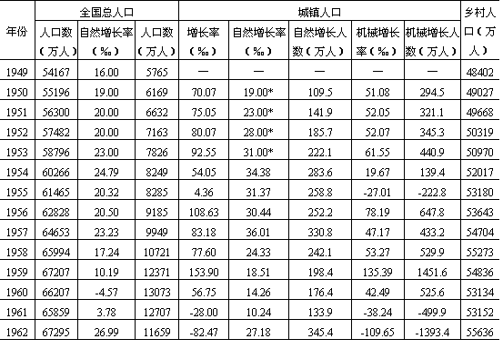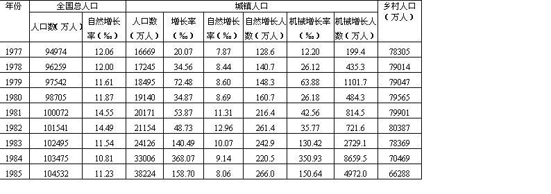 说明:(1)所有资料均为年底数; (2)台湾省及港澳地区暂未计入; (3)总人口、自然增长率、乡村人口、城镇人口、城镇人口自然增长率(未加星号)取自《中国统计年鉴》(1986); (4)城镇人口自然增长率加“*”号者取自田雪源:“1949年以来人口增长综述”表10,载刘铮主编《中国人口:问题与展望》第46页,新世界出版社,1981年; (5)农村中镇人口自然增长率参照城市自然增长率计算。