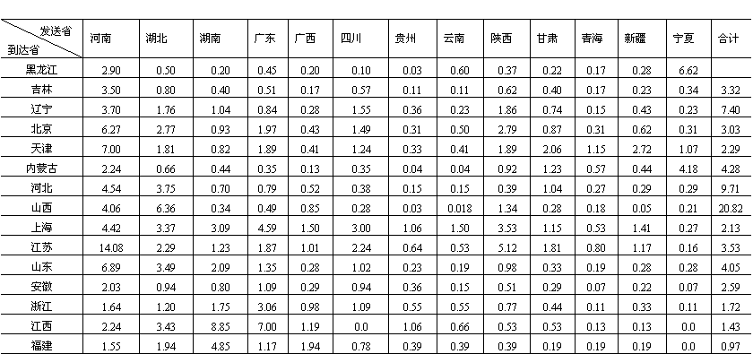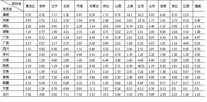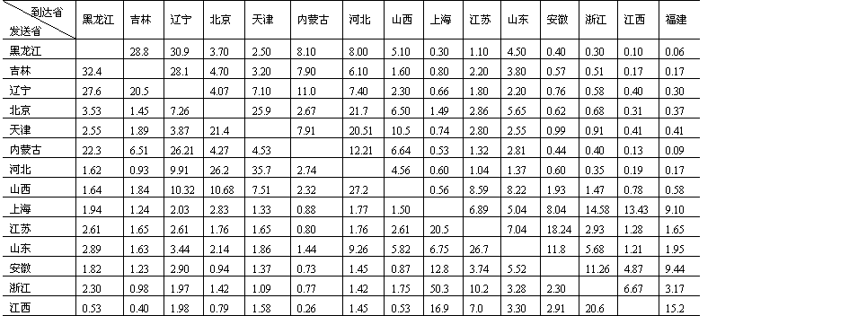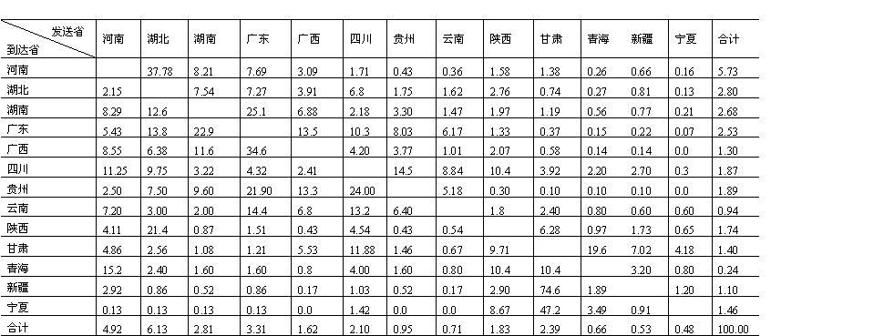 城市化同工业化、区域经济现代化具有形影相伴的客观发展关系。在我国原有的经济体制下,长期地把消灭城乡差别曲解为限制、削弱城市(镇)的发展,搞“城乡穷拉平”,加上按行政区划和行政建制组织经济生活,人为地限制了城市经济中心作用的发挥,造成了城乡分割、流通阻塞,既影响了城市有规律的向外扩散,使部分城市过分膨胀,又阻碍了农村商品经济的发展和小城市、小城镇的成长。为了改变上述状况,参照全国省际货物流量流向(表15-3),从建立我国城镇体分区系入手,以经济比较发达的城市为中心,逐步建立我国以城市为依托的城市经济区域系统。据初步研究,拟建成九大城市经济区。它们是:(1)以沈阳为中心,包括黑、吉、辽三省和内蒙古东三盟一市在内的东北城市经济区;(2)以京津唐城市群为中心,包括冀、鲁二省及苏北、皖北、豫东北、内蒙古锡盟地区在内的华北城市经济区;(3)以西安为中心,包括晋、陕(除陕南盆地)、宁三省及甘(肃)东、青(海)东、豫西、内蒙古河套地区在内的西北城市经济区;(4)以上海为中心,包括沪、赣二省(市)区及苏、皖中南、浙东北在内的华东城市经济区;(5)以武汉为中心,包括鄂、湘两省区及陕南、豫南在内的华中城市经济 表15-3中国省际货物流一览表(1984年) 单位:%