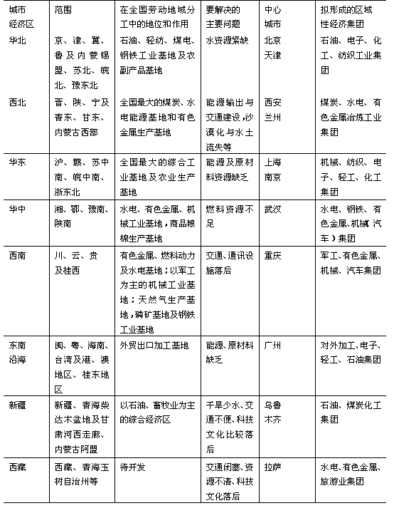 区;(6)以重庆为中心,包括川、云、贵三省及桂西、陇南武都地区在内的西南城市经济区;(7)以广州为中心,包括粤、闽、台、海南四省区及桂东、浙南和港澳地区在内的东南沿海城市经济区;(8)以乌鲁木齐为中心,包括新疆、青海柴达木盆地、甘肃河西走廊、内蒙古阿盟在内的新疆城市经济区;(9)西藏自治区及青海玉树藏族自治州(包括唐古拉山地区海西自治州部分),由于地处我国青藏高原,远离大经济中心城市,自然环境恶劣,区域交通网络还未形成,暂划为一个独立的西藏城市经济区。各城市经济区经济开发重点分述如下: 1.东北城市经济区 东北城市经济区是沈阳城市群和哈尔滨、长春、大连为核心的工业发达地区。在东北近代经济开发史上,辽、吉、黑和内蒙古东三盟一市具有其共同的特点。概括起来,在地理上它们连成一片,多种多样的自然条件,构成了山环水绕、沃野千里的优越生态环境;在经济上东北三省与内蒙古东三盟一市通过铁路网已形成为一个统一有机的经济网络系统①。 东北城市经济区域是我国最早建立起来的重要工业、农业基地之一。目前,全区拥有工业企业数占全国的1/10,钢铁和钢材产量占全国1/4,原油产量占1/2以上,10种有色金属产量占全国1/5,汽车占1/4,机床占1/5,在全国经济建设中具有举足轻重的地位。但从整个东北城市经济区看,内部发展很不平衡,而且能源和交通势必成为地域经济开发的限制因素。鉴于此,我们认为东北城市经济区的开发应当首先抓好东部现有煤矿、铁路的技术改造,早日缓解东北能源、交通紧张的局面;其次,从全局出发,制定开发西部①战略决策,从根本上解决东北城市经济区能源、交通问题。东北西部具有丰富的褐煤、石油资源和发展坑口、路口电站的能力,又居联结关内外的重要通道的地理位置,能源的充分开发和运输条件的极大改善,将有利于这一地区褐煤、石化、林产、畜产品、氯碱、硅砂、农产品等的深度加工和综合利用,从而相应建成一批新型工业基地。总之,开发建设东北西部,对于改变东北城市经济区总面貌,使东北地区生产力布局更加均衡、合理,对繁荣少数民族地区经济、文化均具有重要的战略意义。 2.华北城市经济区 华北城市经济区,无论是在地理上,还是经济上,以及历史发展上,都是以黄淮海河流域为主体,包括整个华北大平原为统一体而发展、形成的城市经济区。这一地区拥有以能源(石油和煤炭)、化工、轻纺、机械为主导工业的雄厚实力,又是我国政治、文化中心之所在,也是我国重要的粮食、棉花、油料、果品生产基地,在我国政治、经济、文化、科技、交通诸领域中均占有十分重要的地位。 但从整个地域经济发展水平看,存在着严重的地域不平衡性。现状经济发展主要集中于京津唐地域,而广大沿海及黄淮河下游流域,尽管拥有十分丰富的石油、煤炭等能源资源和海洋资源,经济开发则呈现为明显的“低谷”状态。 据此,地域经济开发拟首先发展以石油、煤炭等能源工业、综合化工(包括海洋化工、石油化工和煤化工)、农副产品加工和旅游业为主的支柱产业;其次尽快治理黄淮海平原,建设南水北调工程,从根本上排除淡水资源匮乏这一区域经济开发的制约因素;再次,制定开发滨海地带及黄淮河下游“低谷”地带的战略决策,从发展的眼光看,这一区域将派生出北部首都城市经济亚区和南部淮海城市经济亚区两大地域。 3.西北城市经济区 西北城市经济区,在地理上属于我国的内西北区域。它是我国历史上农耕文化最发达、地域经济开发历史最悠久的地区。长期以来一直是我国行政、经济、文化的重心区域所在,素有“中华民族摇篮”的美称。自封建社会晚期,尤其近代以来,由于政治、经济多方面的因素,地域经济的发展出现了持续大范围的衰退。新中国建立以来,尽管十分注重发展这一地区的社会生产力,区内城市区域经济发展已具有一定基础,现已初步形成沿陇海、包兰、青藏等铁路沿线经济发展地带和经济中心,但内部发展水平差异仍然很大。从发展的眼光看,这一地域蕴藏着我国分布范围最大的煤矿和巨大的黄河上游水能资源,随着山西、陕西(渭北及陕北)、豫西、内蒙古河套地区(准噶尔、东胜等)和宁夏石咀山等大型煤田的开发,随着甘肃有色金属、青海盐类矿产及黄河中上游河段巨大水力资源的开发,将必然形成为我国最大的以能源开发为主体的新型城市经济区域。 地域经济开发,首先以能源开发为突破口,重点开发山西、豫西、陕北、内蒙古河套地区的煤炭资源,以及黄河上游水电资源;其次,加强交通设施建设,建立多通道的区际煤炭运输通道和输电走廊;再次,进行分区开发,建成多个地域工业综合体。它们主要有:黄河上游梯级开发水电——有色冶金——石油化工——机械工业综合体;陕北、内蒙古河套西部及宁夏北部煤炭——电力——化工工业综合体;渭北、关中煤炭——电力——机械(含电子)工业综合体;山西能源——化工工业综合体和豫西煤炭——有色金属冶炼工业综合体等。 4.新疆城市经济区 新疆城市经济区是我国地理上的外西北区。在地理环境上是一个完整的自然地理单元,具有草原、沙漠、戈壁广布,高山、盆地南北相间,自然资源优势突出,干旱区城市(镇)发展特色明显的特点。甚至在国民经济发展,交通设施建设,以及社会、文化、政治、军事