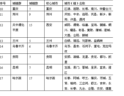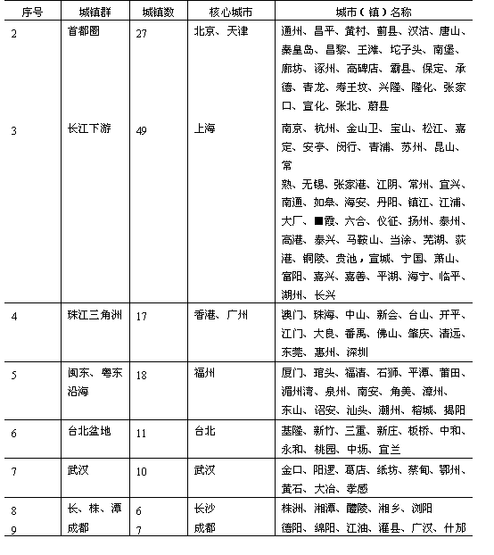 在21世纪我国城镇体系发展过程中,一部分特大城市和大城市必然将发展成为分区或地域(不同层次)城镇体系的核心。在这类核心城市中,又有一部分城市必然由于比较优越的发展条件,不断地扩大城市联系的地域范围,以致使一组城市相继形成为某一地域(或分区)城镇体系的“核心地带”,从而逐渐构成我国城镇体系地域空间结构“点——轴——面”系统的“点”的集合。这种“点”的集合,从区域城市分布空间看一般都表现为城市群的特征。现列表如下: 表16-1 21世纪中国城镇体系“点”的开发