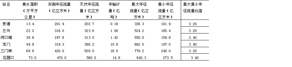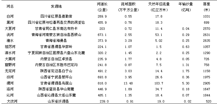 注:天然年径流量为1956~1979年平均值。年输沙量为各支流控制站实测资料`平均值。 亿。上游草原辽阔,是中国羊毛、皮革和其他畜产品的主要产地。中、下游有广大的黄土高原和冲积平原,是中国农业发源地之一。陕、豫、鲁等省的小麦、棉花在全国占重要地位。黄河鲤鱼闻名。河口滨海浅海区出产毛虾、对虾等20多种水产品。 黄河流域蕴藏有煤、石油和铁、铜、铝、铅、金、银、钨、铬、镁等矿藏,目前已逐渐形成上游水电基地、中游煤炭基地、下游石油基地的能源工业的布局。是中国举足轻重的三大常规能源基地。流域亦为中国重要工业区,重要城市有西宁、兰州、银川、包头、西安、太原、洛阳、郑州、济南等。有京广、京沪、陇海、兰新、京包、包兰、兰青、青藏、太焦、焦枝、新焦、新济、济石、同蒲、石太、宝成等铁路干线和支线。1949年前黄河上仅有兰州、郑州、济南3座大桥,至1990年底已建成桥梁75座,沟通了两岸交通。 黄河干流仅部分河段通行木船和小型驳船。 黄河是中华民族的摇篮。远在80万年以前黄河流域就有人类活动,新石器时代已有定居农业。距今约3500年前,位于黄河流域的商王朝已成为当时世界三大文明中心之一。由夏至北宋,黄河流域一直是中国政治、经济、文化的中心。 历史灾害黄河的洪水灾害闻名于世。危害最烈的是在下游。黄河一年中有4个汛期,夏季的称为“伏汛”,1933年河南陕县水文站洪峰流量2.2万立方米/秒。1958年河南花园口水文站最大洪峰流量达到2.23万立方米/秒。据历史洪水调查推算,1761年和1843年,花园口和陕县站出现过3.2万和3.6万立方米/秒的洪峰;此外,还有9~10月的“秋汛”,3~4月的“桃汛”和春初的“凌汛”。 伏汛和秋汛通常合称为“伏秋大汛”。 20世纪50年代以前黄河常发生决口泛滥以至改道的严重灾害。有历史记载的2000多年中,黄河下游发生决口泛滥1500多次,重要的改道26次。见于文字记载最早的黄河下游河道,称为“禹河故道”,大体经河北,由今滏阳河道、子牙河道,至天津附近入海。从公元前602年黄河第1次大改道起,至公元1855年改走现行河道。 其间,1128年以前,河走现行河道以北,由天津、利津等地入海;以后走现行河道以南,夺淮河入海。灾害波及海河、淮河和长江下游约25万平方公里的地区。每次决口泛滥都造成惨重损失,1933年下游决口54处,受灾面积1.1万多平方公里,受灾人口达360多万人。1938年国民党政府扒开郑州以北花园口黄河大堤,淹死89万人,造成著名的黄泛区。 黄土高原水土流失严重。沟道密度2~7公里/平方公里,沟壑面积占土地面积的30~50%,有的达60%以上。但黄河的冲刷和淤积却是华北平原形成的重要因素之一。 黄河流域旱灾严重。公元前1766~公元1944年,有记载的旱灾即达1070多次。公元1877~1879年鲁、豫、冀、晋4省连续3年大旱,饿死1300多万人。1929年黄河流域普遍大旱,灾民达3400万人,1942~1943年,豫、冀、皖等省大旱,仅河南省就饿死数百万人。 治理成就远在春秋战国时代黄河两岸已修筑了堤防。两汉时代,抢险、堵口和保护堤岸的“工程”已经出现。宋代已有简单的报汛方法和防汛制度。公元1世纪后半期(东汉永平)的王景,16世纪后半期(明嘉靖到万历)的潘季驯,17世纪后半期(清康熙)的靳辅,陈璜等,对于黄河下游的修堤防汛工作,都有重大贡献。 1955年第一届全国人民代表大会第二次会议通过了《关于根治黄河水害和开发黄河水利的综合规划的决议》,展开了大规模综合治理黄河的工作。 下游修防,加高加厚大堤,堤身高普遍达9~10米,顶宽7~11米,发现和填实堤身内部的洞穴、裂缝等各种隐患33万多处。引黄河水淤平潭坑、洼地,淤高背河地面,增强大堤抗洪能力。大堤上的险工坝岸全部改建为石坝。大堤植树种草,实现了绿化,防止风波和雨水对堤身的冲刷。下游河道也进行了整治,修筑了170多处护滩控导工程,同130多处险工、5000多道坝岸相配合,使山东省东明县高村以下400多公里的河道得到控制,高村以上也缩小了主溜游荡范围。还修建了三门峡、陆浑等防洪水库,开辟了北金堤、东平湖滞洪区,初步组成了“上拦下排,两岸分滞”的防洪工程体系,改变了单纯依靠堤防守堤防险的局面,并组织了强大的群众防汛队伍,战胜了历年的洪水,特别是战胜了1958年花园口站2.23万立方米/秒的大洪水,改变了黄河历史上“三年两决口”的险恶局面。 上中游水土流失地区广泛开展了工程措施和生物措施结合的水土保持工作。初步治理水土流失面积8万多平方公里,取得了减沙增产效果。上中游地区建成660多万公顷防护林。 远在2000多年前黄河流域就修建了大规模的引水灌溉工程。公元前246年在关中平原修建了郑国渠。汉武帝时在关中修建了白渠、灵轵渠、成国渠、