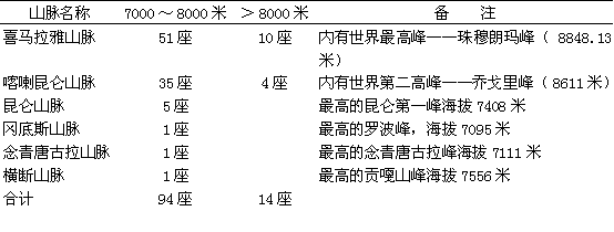 隆起范围不断扩大,古地中海则随之由北而南撤退,直至始新世晚期,西藏地区最终全部脱离海侵成陆。据古植物化石和孢粉、古土壤及上新世地层中三趾马动物群化石等推断,上新世末,原始高原面的海拔仅约千米,更新世后的喜马拉雅运动使高原地区整体大幅度急剧隆起,遂成地球之巅。这一期间上升幅度累计达3000~4000米(表1)。若以晚更新世以来的十余万年计算,年均上升量达10毫米以上。至今,高原仍以年均5~6毫米的速度继续上升。 根据板块运动理论,认为青藏高原的隆起是印度板块向北漂移,同欧亚板块碰撞并俯冲于后者之下的结果。 同时可能还受北方刚性的塔里木地块向南楔入青藏地块的动力作用的影响。 地貌 高原海拔大多在3500米以上,总倾向为西北高、东南低。主要大山有东西或近东西走向、由北而南依次排列的阿尔金山脉、祁连山脉、昆仑山脉、喀喇昆仑山脉、唐古拉山脉、冈底斯山脉、念青唐古拉山脉、喜马拉雅山脉及北西—南东或南北纵列走向的横断山脉。它们大多海拔在5500米以上。许多高峰海拔在7000米以上(表2),珠穆朗玛峰、乔戈里峰及希夏邦马峰等则都超 表2 青藏高原海拔7000米以上的高峰数量概计