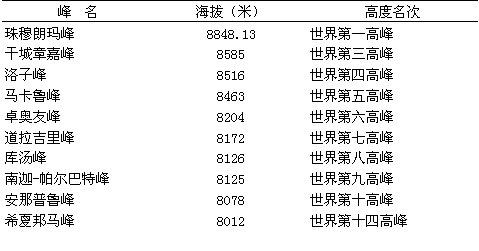 高峰中即有10座分布于此(见表)。主脉上的一些山口要隘也多分布于海拔4000~5000米。其中较著名的如东段的唐拉山口(海拔4633米)、中段的聂聂雄拉山口(海拔5000米)及西段的索吉山口(海拔3529米)等。高山顶部终年积雪,现代冰川作用强盛,冰川规模较大,著名的有珠穆朗玛峰中国境内的绒布冰川、加布拉冰川及锡金境内的热木冰川等。冰川总面积3.3万平方公里,中国境内约占1/3。雪线高度5800~6 200米,南坡雪线低于北坡。(参见彩图插页第56页) 地质 喜马拉雅山主脊系由前寒武纪结晶岩和变质岩—花岗岩、片麻岩和片岩及寒武—奥陶纪的浅变质岩—结晶灰岩、板岩与千枚岩等组成。北坡自奥陶纪至始新世的海相地层—灰岩、页岩、砂岩等总厚度达1100米。喜马拉雅山脉是青藏高原上隆起最晚的年轻山脉。于始新世古地中海撤退时开始升起,后经数次断块上升而形成。据希夏邦马峰北坡海拔5700米处发现高山栎古植物化石推断,上新世以来喜马拉雅山脉约升高了2000米。同时,南北向水平挤压,喜马拉雅山脉强烈褶皱,并具掀升性质,形成向北倾斜的叠瓦状构造,山脉南陡北缓两坡不对称。喜马拉雅山地壳极不稳定,新构造运动十分活跃,地震活动频繁而强烈,是世界上主要大地震带之一。此外,南北走向的断裂构造发育,经河流切割形成纵向深险峡谷,成为西南季风气流北进的通道。 气候与垂直自然带 喜马拉雅山脉南北两侧气候迥异。山南气候暖热湿润。如墨脱(海拔1 130米)和樟木(2300米)两地,最热月均温分别达22.1℃和17.3℃,年降水量分别为2300毫米和2800毫米,位于山麓的巴昔卡(157米)的年降水量则超过4400毫米。山北温凉干燥,一般最热月均温多低于10℃,年降水量少于400毫米。气候垂直变化明显。南北两坡的地形、水文、生物、土壤及农业生产差异均大。以喜马拉雅山脉东段为例,南坡地势险峻,河网密,流水侵蚀强,原始森林葱郁,植物种类丰富,森林土壤多样。山地垂直带是:①海拔1100米以下的低山丘陵为热带雨林和季雨林-砖红壤性土壤带。②1 100~2300米为山地亚热带常绿阔叶林-黄壤带。③2300~2900米为山地暖温带针阔叶混交林-黄棕壤和棕壤带。④2 900~4 100米(森林上限)为山地寒温带云、冷杉暗针叶林-暗棕壤和漂灰土带。⑤森林上限~4 400米为亚高山寒带杜鹃、山柳等灌丛和高山嵩草草甸-亚高山灌丛土和高山草甸土带。⑥4 400~4 800米(雪线)为地衣、苔藓与座垫植物等组成的高山冰缘稀疏植被-寒冻土带,雪线以上为高山永久冰雪带。垂直自然带属海洋性湿润型系统。种植上限不超过4 000米。在山麓谷地内可种植水稻、鸡爪谷、玉米与小麦等多种作物,一年两至三熟。可种茶树、甘蔗、柑橘与香蕉等。密林中常见麂、麝、黑熊、猴、小熊猫、各种毒蛇和羽毛鲜艳的鸟禽等。北坡地势相对和缓开阔,海拔一般在4000米以上,气候寒冷干燥。湖盆与宽谷地形发育,河流稀少,干旱剥蚀较强,森林面积骤减,除东部河谷地区有森林分布外,海拔5000米(高山草甸带下限)以下多为紫花针茅等禾本科植物组成高山草原带。海拔4000米以下较温暖的朋曲河上游与雅鲁藏布江中游宽谷则为山地灌丛草原带,属草原土壤类型。垂直自然带属大陆性半干旱型系统。大部分地区为天然牧场,仅沿河沃土辟为耕地,可种植青稞、小麦、油菜和豌豆等作物,一年一熟。最高种植上限在聂拉木附近海拔4760米处。有野牦牛、藏原羚、旱獭、鼠兔和狐等野生动物。 喜马拉雅山脉东湿西干,西段(东经85°、吉隆一带以西)的山麓地带已无热带森林,并在干燥河谷中出现长叶松、长叶云杉及霸王鞭类浆质刺灌丛。