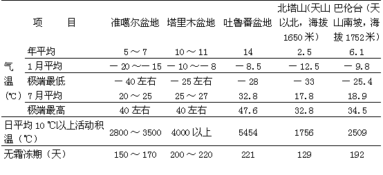 地气温偏高,7月均温达32.8℃(见表)。气温分布一般随纬度增加和海拔上升而降低。天山对寒潮的阻挡作用更加深了气温的南北差异。天山以北属中温带,天山以南属暖温带。山地夏季气温垂直递减率明显,冬季山地存在逆温层,山麓和平原气温低于中、低山带,海拔上升千米,气温增加3~5℃,逆温层历时4~5月。各山系逆温层厚度不同,天山北坡为2 000~2 500米,南坡为1500~2 000米,而昆仑山系为1000~1500米,阿尔泰山逆温层不明显。新疆昼夜温差较中国同纬度地区都大,气温平均日较差南疆为14~16℃,北疆为12~14℃,山区约10℃;年最大日较差约为25℃。气温日较差大,对农业十分有利。新疆瓜果含糖量高,品质优异,与此有关。除气温日较差大外,光照较中国同纬度地区丰富,亦为新疆气候的显著特点之一。年日照时间达2 550~3 500小时,其分布自北向南略有减少,从西向东则逐渐增加;从平原到山区,北疆减少,南疆则略有增加。在植物生长期内光照充足,生长加快,因而积温的有效性高,各种作物所需的积温较同纬度其他地区为少。如天山北麓北纬45°附近可种水稻和棉花,而西欧同纬度地区棉花不能种植,水稻亦少见。 新疆是中国典型的干旱区,年均降水量约145毫米。 降水的分布规律是,北疆多于南疆,西部多于东部,山地多于平原,山地西段多于东段。山区降水量,阿尔泰山南坡和天山北坡为400~600毫米,伊犁河上游迎风坡最大降水量接近1000毫米;天山南坡东段约200~300毫米,西段约400~500毫米;昆仑山北坡的中段和东段,一般不到200毫米,西段及中段局部山区约400毫米。平原年降水量,准噶尔盆地边缘约200毫米,盆地中心及东缘100~150毫米;塔城盆地和伊犁谷地均300毫米;天山以南平原降水量均不超过100毫米,塔里木盆地西缘和北缘约50~70毫米,盆地中心及东南缘及哈密、吐鲁番盆地仅10~20毫米,托克逊城年均为5.9毫米,为中国年降水量的最低记录之一。 新疆境内上空每年水分输送总量约1.154 0万亿立方米,其中降落到地面上的水量约2 400亿立方米。自治区年均降水量145毫米,为中国年均降水量(630毫米)的23%。在降落到地面的水量中,能形成径流并汇纳为大小河流的径流总量为830亿立方米,尚不及全国径流总量(2.711 4万亿立方米)的3%。年均径流深为50毫米。地表径流和大气降水两者的分布规律一致,其特点是:地表径流几乎全部来自山区,地区分布西部多于东部,北疆多于南疆。境内河流多以高山冰川雪水为源,且多流失于盆地沙漠,或积水成咸湖。全境如以北塔山经乌鲁木齐、库尔勒至叶城划一直线,线西北土地面积约占新疆总面积的40%,而其所产生的年径流量却约占新疆的80%;线东南土地面积占60%,产生的年径流量仅占20%。新疆的水文情况亦具有明显的干旱环境特点:①全境因周围高山阻隔,降水量少,河流除额尔齐斯河属外流河外,其余均属内流河。湖泊则以咸水湖居多,淡水湖较少。②多数河流可分为径流形成区和径流散失区,其分界点在山口。山口以上河流,从上而下水量逐渐增加;山口以下水量被大量引入灌区,而补给甚少,径流逐渐散失。③河流数量多,流程短,水量少,多无航运之利。 新疆境内共有大小河流570条,年径流量约为810亿立方米。其中,北疆有河流387条,年径流量406亿立方米;南疆有河流183条,年径流量404亿立方米。主要河流有:额尔齐斯河,发源于阿尔泰山东南,出国境后注入斋桑泊,是中国属北冰洋水系的唯一河流,也是新疆境内唯一的外流河。塔里木河是中国干旱地区最长的内流河,由阿克苏河、和田河、叶尔羌河汇合而成,穿流于塔里木盆地北缘,全长约2200公里,下游经常改道,有时东流经孔雀河入罗布泊,有时南流注入台特马湖。伊犁河穿行于伊犁河谷,向西流出国境后注入巴尔喀什湖,是新疆境内水量最大的内流河。主要湖泊以罗布泊为较大,现已干涸,湖面变化大。博斯腾湖为中国最大的内陆淡水湖,艾丁湖则为中国海拔最低的湖泊。此外,还有乌伦古湖、艾比湖、赛里木湖、巴里坤湖等及著名的天池。 植被与土壤 新疆境内在高山和高山地区及山前洪积-冲积平原分布着大面积的草原,阿尔泰山、天山等高山深处分别有绵延呈带状分布的西伯利亚落叶松和雪岭云杉、云杉等山地针叶林,塔里木河等大河下游沿岸生长着胡杨林与灰杨等为主的阔叶林。此外,大部分地表多为植被稀疏、种类贫乏的荒漠植被所覆盖,土壤类型多种多样,南北差异显著。 在北疆准噶尔盆地北部平原、阿尔泰山及其山前平原、准噶尔盆地以西山地的西北部和塔城盆地,植被以蒿属和假木贼或小蓬为主的半荒漠(包括荒漠草原和草原化荒漠),并混生有羽茅;地带性土壤为棕钙土,隐域性土壤有草甸土和面积不大的盐土和沼泽土。西部天山及伊犁谷地植被属具有短命植物的蒿属半荒漠,地带性土壤为灰钙土,隐域性土壤以草甸土和草甸沼泽土分布较广,草甸盐土则面积较小。准噶尔盆地东部戈壁,中部沙漠和西部平原等地,植被为以麻黄、梭梭、假木贼、霸王、伊林藜和小蓬为主的荒漠,地带性土壤为灰棕色荒漠土。中部天山及其北麓平原,植被属以蒿属和琵琶柴荒漠为主,地带性土壤为荒漠灰钙土。南疆地区在平原范围内,植被多属以麻黄、伊林藜、合头草、琵琶柴、假木贼、泡果白刺等为主的半灌木和灌木荒漠,地带性土壤为棕色荒漠土和石膏棕色荒漠土。随着干旱程度的进一步增强,在塔里木盆地南部和东南部、