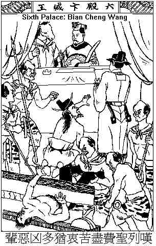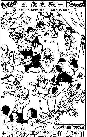 *一殿秦广王.专司人间寿夭生死册籍.统管幽冥吉凶.鬼判殿居大海沃 石外.正西黄泉黑路.凡善人寿终之日.及有接引往生.凡勾到功过两平之男妇.送文第十殿发放.仍投人世.或男转为女.或女转为男.较量富贵贫贱.以了冤缘相报.凡恶多善少者.使入殿右高台.名为孽镜台.台高一丈.镜大十围.向东悬挂.上横七字.曰:孽镜台前无好人.押赴多恶之魂.自见在世之心之险.死赴地狱之险.那时方知万两黄金带不来.一生惟有孽随身.入台照过之後.批解第二殿.用刑发狱受苦.