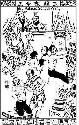 *如犯讲究风水.阻止殡葬.造坟掘见棺椁.不即罢垦换穴.有损骨殖.偷漏条粮.遗失宗亲坟冢.诱人犯.法.教唆兴讼.写作匿名揭帖退婚字据.捏造契议书札.收回钱债券据.不注不掣套描花押图记.添改怅目.遗害後人等事件者.查对事犯轻重.使大力鬼役推入大狱.另发应至何重小狱受苦.受满转解第四殿.加刑收狱.