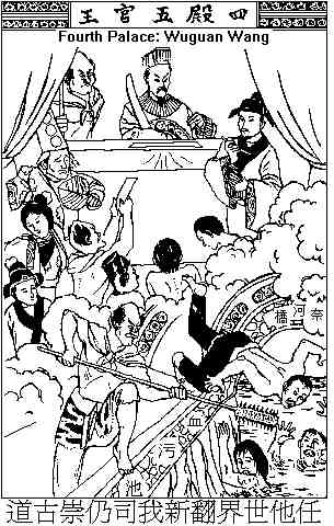 *台居第十殿.冥王殿前六桥之外.高大如方丈.四围廊房一百零八间.向东[甬]道一条.仅阔一尺四寸.凡奉交到男女等魂.廊房各设盏具.招饮此汤.多饮少吃不论.如有刁狡鬼魂.不肯饮吞此汤者.脚下现出钩刀绊住.上以铜菅刺喉.受痛灌吞.诸魂饮毕.各使役卒搀扶从甬[通]道而出.推上麻扎苦竹浮桥.下有红水横流之涧.桥心一望.对岸赤石岩前上.有斗大粉字四行.曰: