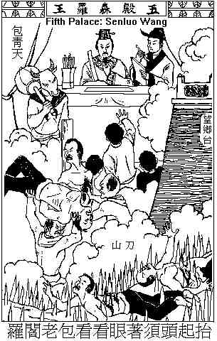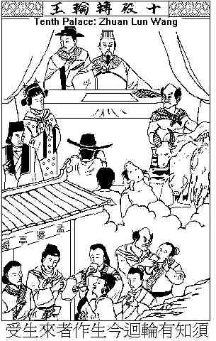 *十殿转轮王.殿居幽异沃 石外.正东直对世界五浊之处.设有金银玉石木板奈何等桥六座.专司各殿解到鬼魂.分别核定.发往四大部州何处.该为男女寿 富贵贫贱之家投生者.逐名详细开载.每月汇知第一殿.注册送呈酆都.阴律凡胎卵湿化.无足两足四足多足等类.死就为[上渐下耳][失魂鬼].轮推磨转.或年季生死.或朝生暮死.翻覆变换.为不定杀.为必定杀之类.概令转劫所内.查较过犯.乃发各方受报.岁终汇解酆都.