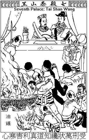 *世人漏税.抗粮.赖粗.用重秤.合假药.卖著水米.用假银.欠数钱.卖油粉 绫.刮浆布疋衣裤.路遇蹩废老幼.不即让行.暗占乡民及老幼肩贩便宜.受托寄带家书.不速交付.窃取街路砌就砖石及晚夜灯内油烛.穷不安分守己.富不怜老恤贫.如有告贷.先已允借.至期空覆.致令误事.见人有病.家藏药食.吝不付给.良方秘不传授.煎过药渣.或碎碗料器等物泼置街路.无故养驴马诸兽.尿粪妨碍行人.故意荒芜田地.损坏他人墙壁.咒诅魇魅.造言惊吓等事者.查核事犯之大小.令鬼卒推入各大地狱受苦.另再判发何小地狱受苦.满日送解第五殿察核.