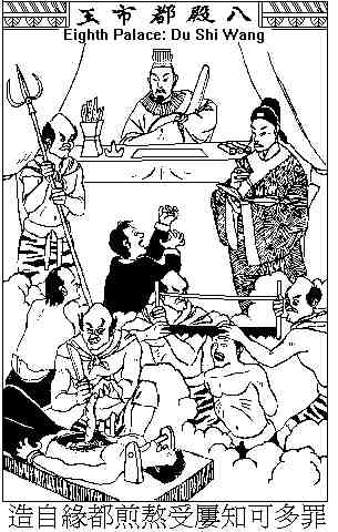 *凡在阳世.炼食红铅阴枣人胞.饮酒费用.较过本身日常应用银钱之数.抢夺.略诱.略卖.盗取棺内衣饰.取死尸骨殖为药.离散他人至戚.将养媳卖与他人为婢妾.任妻溺女.闷死私孩.朋赌分财掉帛.师长教导不严.误人子弟.不顾轻重上下.拷打门徒婢仆致令暗伤得病.鱼内乡里.装醉违悖尊长.枉口嚼舌.尖酸搬斗.变生事端者.逐细查明.在此热恼大地狱内提出.发交何重小狱受苦.满日转解第八殿收狱查治.