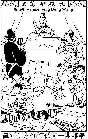 九殿平等王.司掌大海之底.西南沃 石下.阿鼻大地狱.圜叠绕广八百由旬.密设铁网之内.另设十六小地狱.