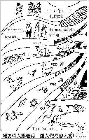 *凡有禽畜鱼虫.受过万千百十等劫已满.如胎生各兽.卵生蛟龙龟蛇飞鸟.湿化相生.蜂蝶蛆虫之类.使其转变轮回受报.复投为胎生等类.劫数已满.若能三世不伤物命.可使复为人者.叙明册籍.奏呈第一殿.批判发往.弗於逮瞿耶尼阎浮提郁单越四大部洲之中.为男女者.即交 忘台下.