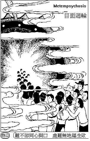 *一个是垢面流血.身穿白衫.手捧算盘肩背米袋.胸悬纸锭.愁紧双眉.声声长叹.其名死有分.催促推魂.落於红水横流之内.根行浅薄者.欢呼幸得人身.根行深厚者.悲泣自恨在生未修出世功德.苦根难断.男妇等魂.如醉如痴.粉纷各投房舍.阴阳更变.气闷昏昏.颠倒不能自由.双足蹬破紫河车.奔出娘胎.[外口内力]的一声落地.日久口贪滋味.勿顾物命.渐失如来佛性.有负天帝神佛慈恩.不虑善终恶死.何样结局.而复有作拖尸之鬼矣.