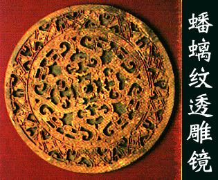 透雕镜又称夹层透纹镜,由镜面和镜背两块铜片合贯而成。镜背的透雕图案,以蟠螭纹为主。江陵张家山201楚墓所出蟠螭纹透雕镜(图6),构图匀称,有极强的艺术感染力。
