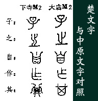 西周时期的楚国文字,与中原诸国的文字还没有多大区别。楚公家钟铭文就与宗周钟的铭文风格类似,气势浑厚,规整,略显波折。春秋至战国中期,楚国文字形体逐渐趋向修长,笔划细而首尾如一,排列比较整齐美观,笔势圆转流畅,风格自由奔放。如王孙浩钟、王孙遗者钟、楚王熊章作曾侯乙博等。从下寺2号楚墓出土的王子午鼎与山东大店2号墓出土编钟铭文的对照中(图1),可以发现楚字的特色,这种楚字,略具虫形,是虫书的雏形。战国中期以后,竹简、帛书式的手写体据主导地位,铜器铸铭、刻铭均受其影响。字形趋扁平、体势简略,横笔昂首,首粗尾细,有的波势挑法己具后世隶书雏形。如江陵望山天星观竹简、荆门包山竹简、长沙楚帛书等等。春秋末,在篆书的基础上,附加鸟形装饰,使文字艺术化,此即所谓“鸟篆”的起源。如楚王孙鱼铜戈铭文共有六个字,均附有鸟形,富有情趣,表现了楚人对鸟类的特别钟爱。与之相关系,楚人的篆刻艺术取得了极高的成就(图2,“冷贤”印)