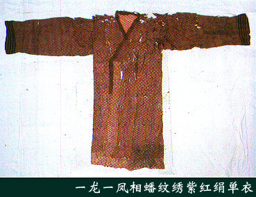 我国传统的服饰有两种基本的形制,即上衣下裳制和衣裳连属制。在楚国,这两种服式是交互使用的。古制上为衣,下为裳。楚国的衣有单衣(图3,一龙一凤相蟠纹绣紫红绢单衣),有夹衣。有面无里的衣称为单衣楚人称为褋,屈原《九歌湘夫人》:“遗余褋兮醴浦”。夹衣是面和里夹合而成的。马山一号楚墓出土有夹衣的实物。