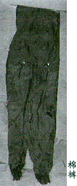 裙的实用功用是遮羞,而不能防寒。裙内穿夸。古代文献中所说的夸是“胫衣”即穿在两腿上的筒套,今所见楚墓出土的夸的实物实际上与裤差别不大,两裆不相连,在背腰处开衩,类似于现在小该穿的开档裤。正因夸有开衩,虽可防腿部严寒,但不能蔽羞,因此,在夸上要加穿裙。夸是裤的雏形,在马山一号楚墓发现了一件长裤,这是目前我国发现的时代最早的一件裤子实物(图5,棉裤)。