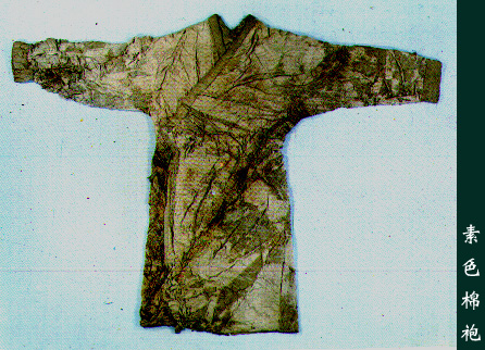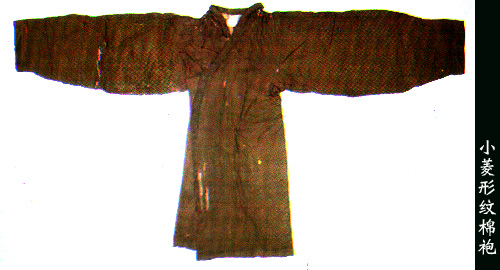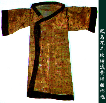 袍服也是衣裳连属的服装,是长可及脚面并有絮有丝棉的冬季服饰。楚庄王的主要服装就是“绛衣博袍”。袍与深衣的区别是,深衣曲裾,袍为直裾。直裾长袍是楚人在深衣的基础上创新的一种新的民族服装。马山一号楚墓共出土了7件袍,这七件袍又可分为三个形制。第一种形制,正身和双袖斜裁下裳正裁(图6,素色棉袍);第二种形制为正裁,两袖平直(图7,凤鸟花卉纹绣浅黄绢面袍);第三种形制也为正裁,但两袖特长(图8,小菱形纹棉袍)。