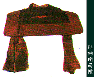 楚人的冠式有獬冠、高冠等。獬冠形状前高后低,,为模仿獬角形状做成,由于楚文王十分喜好戴獬冠,引得楚人竟相效仿。高冠因高耸于头,故而又被楚人称为切云冠。楚人大诗人屈原就以戴这种高冠而为荣。楚人除戴冠外,还戴帻,帻是用于束发的专用头饰,马山一号墓中出土有一件帻的实物(图9,红棕绢面帻)。