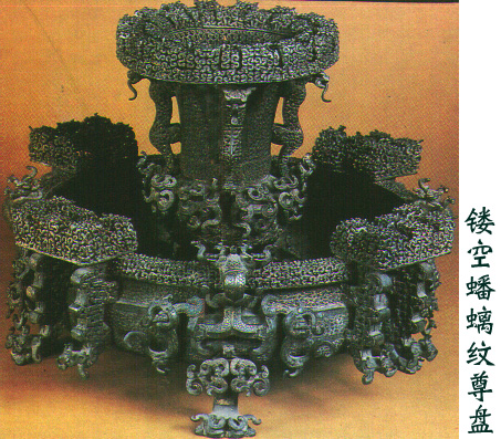 楚国的青铜铸造方法分铸法、失蜡法等。所谓分铸法,即器身与附件不是一次铸成,往往先铸附件,再铸器身,然后用铜或锡作焊剂把器身与附件焊接起来。另外还有用失蜡法与漏铅法铸成的。失蜡法先用蜡料作出铸件的模型,可在蜡模上作出繁复的纹样或使之具有复杂的形状。在蜡模的表面涂以粘土及沙石的粉末等,加热烘烤,蜡模熔化流出,从而形成坚硬的铸件用范。目前我国发现的最早失蜡法铸件是楚共王熊审盏。河南下寺楚墓出土的铜禁、铜盏及曾候乙墓出土的尊盘(图4)也都是我国早期的失蜡铸件。在当时条件下,楚国的这种青铜铸造方法与技术显然是第一流的。
