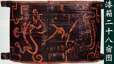 甘德与石申还研究整理了二十八宿体系。一九七八年,湖北随州市擂鼓墩1号墓出土了一个漆箱,箱盖上按星空方位写着二十八宿星名,漆箱箱盖面黑漆底色上绘红彩,中间用粗笔写着一个篆文的“斗”字,绕“斗”字一圈用篆文写着二十八宿名称,盖面一端画着青龙,一端画着白虎,四周绘有图案。这表明二十八宿学说在楚国已广泛流行,这幅二十八宿图,是保存至今的珍贵的天文学资料(图5)。