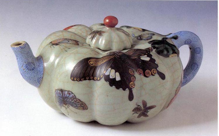 釉蜂蝶纹瓜式茶壶