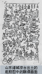 山东诸城凉台出土的一幅汉代的画像石有一幅庖厨图,图中的一部分为酿酒情形的描绘,把当时酿酒的全过程都表现出来了。一人跪着正在捣碎曲块,旁边有一口陶缸应为曲末的浸泡,一人正在加柴烧饭,一人正在劈柴,一人在甑旁拨弄着米饭,一人负责曲汁过滤到米饭中去,并把发酵醪拌匀的操作。有两人负责酒的过滤,还有一人拿着勺子,大概是要把酒液装入酒瓶。下面是发酵用的大酒缸,都安放在酒垆之中。大概有一人偷喝了酒,被人发现后,正在挨揍。酒的过滤大概是用绢袋,并用手挤干。过滤后的酒放入小口瓶,进一步陈酿。