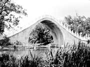 2,拱桥。造型优美,曲线圆润,富有动态感。单拱的如北京颐和园玉带桥,拱券呈抛物线形,桥身用汉白玉,桥形如垂虹卧波。多孔拱桥适于跨度较大的宽广水面,常见的多为三、五、七孔,著名的颐和园十七孔桥,长约150米,宽约6.6米,连接南湖岛,丰富了昆明湖的层次,成为万寿山的对景。河北赵州桥的“敞肩拱”是中国首创,在园林中仿此形式的很多,如苏州东园中的一座。